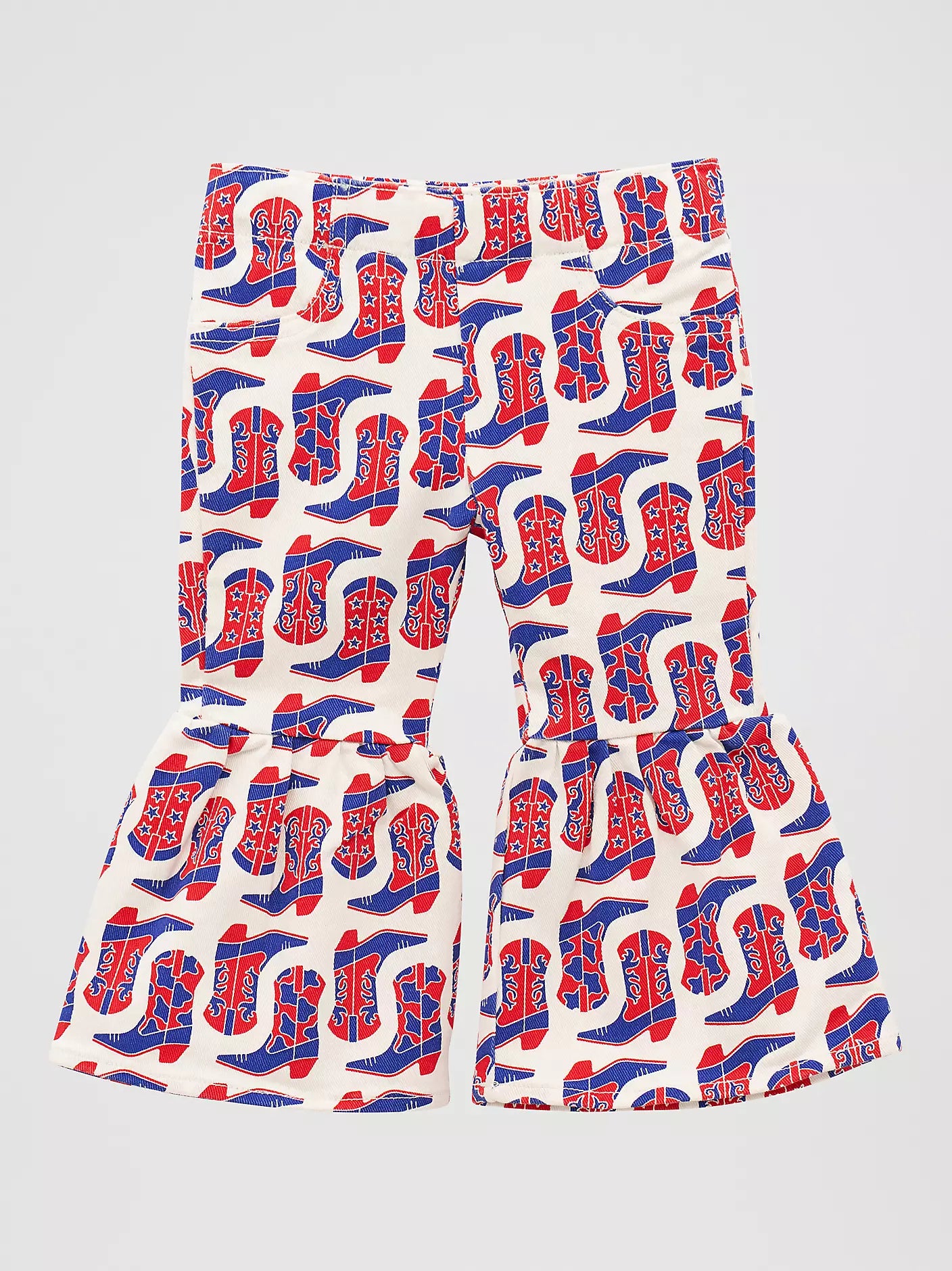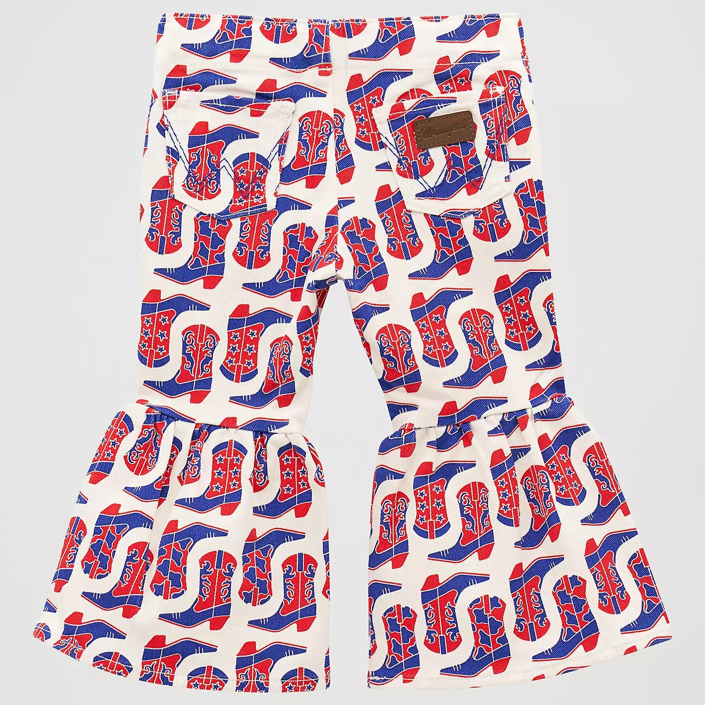 Your little cowgirl will look as cute as can be wearing our Bandana Print Ruffle Flare Jean. These pull-on flares are crafted from 100% cotton and finished with a patchwork print full of paisley motifs. They come with faux front pockets and two patch pockets on the back with the ‘W’ stitching and a logo patch. These jeans flare from the knee down for a retro-inspired look to add a little extra Western flair to her outfits.