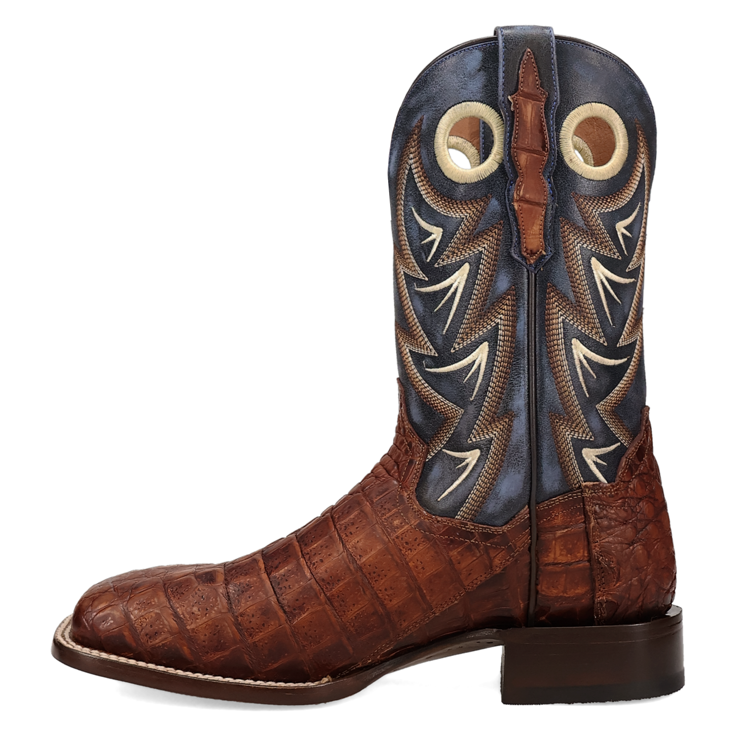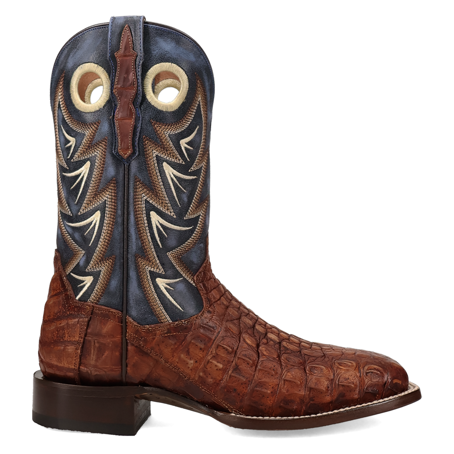 The Marsh pairs bold exotic character with everyday wearability. Crafted with a rich cognac caiman vamp and a striking blue 12” shaft, this men’s boot delivers standout Western style with a broad square toe and classic stockman heel. Built for comfort, it features a removable Soft Strike orthotic and a durable ROM2 rubber/leather outsole for reliable traction and long-lasting support.