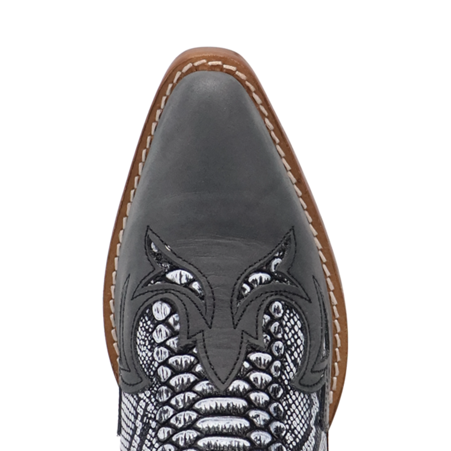 Cobra Kiss is where bold textures meet effortless style. With a striking snake print foot and a sanded matte black leather. This bootie offers a unique blend of fierce and chic. The sleek silhouette and unexpected design details make it the perfect statement piece for anyone looking to add a touch of edge to their look. Cobra Kiss is made to turn heads, one step at a time.