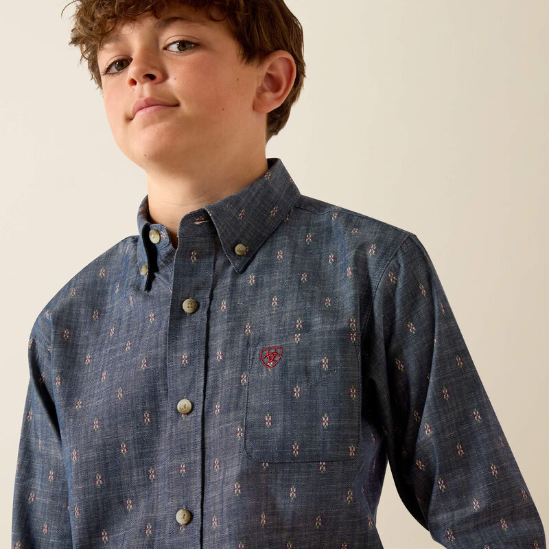 Ariat Boy's Teague L/S Classic Fit Western Button Down Shirt in Chambray Blue Medallion Print