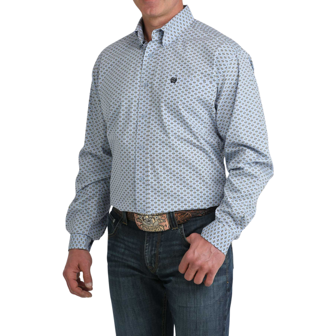Step up your western wear game with this Cinch men's long-sleeve button-down shirt. Featuring a light blue geometric pattern with a small navy blue Cinch embroidered logo on the pocket, it combines eye-catching style with everyday practicality. Made from 100% cotton, this classic-fit shirt offers the strength and comfort you need whether you're tackling work or enjoying downtime. The relaxed fit ensure you can move freely throughout your day. A versatile piece that's ready for whatever comes your way. This shirt also features a navy blue trim inside the collar, and cuffs.
