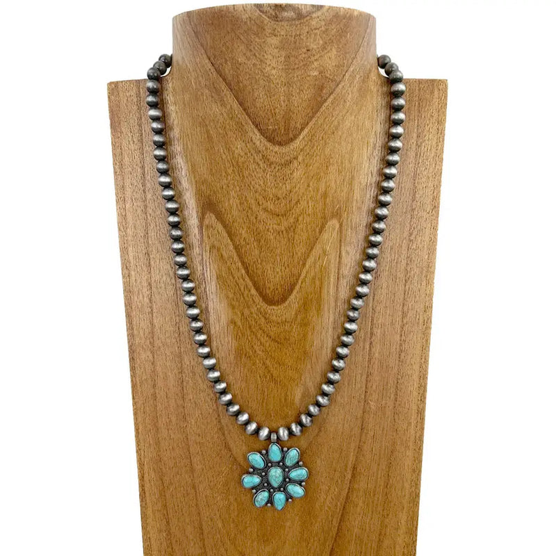 22" Navajo Inspired Pearl Necklace with Turquoise Stone Concho Pendant