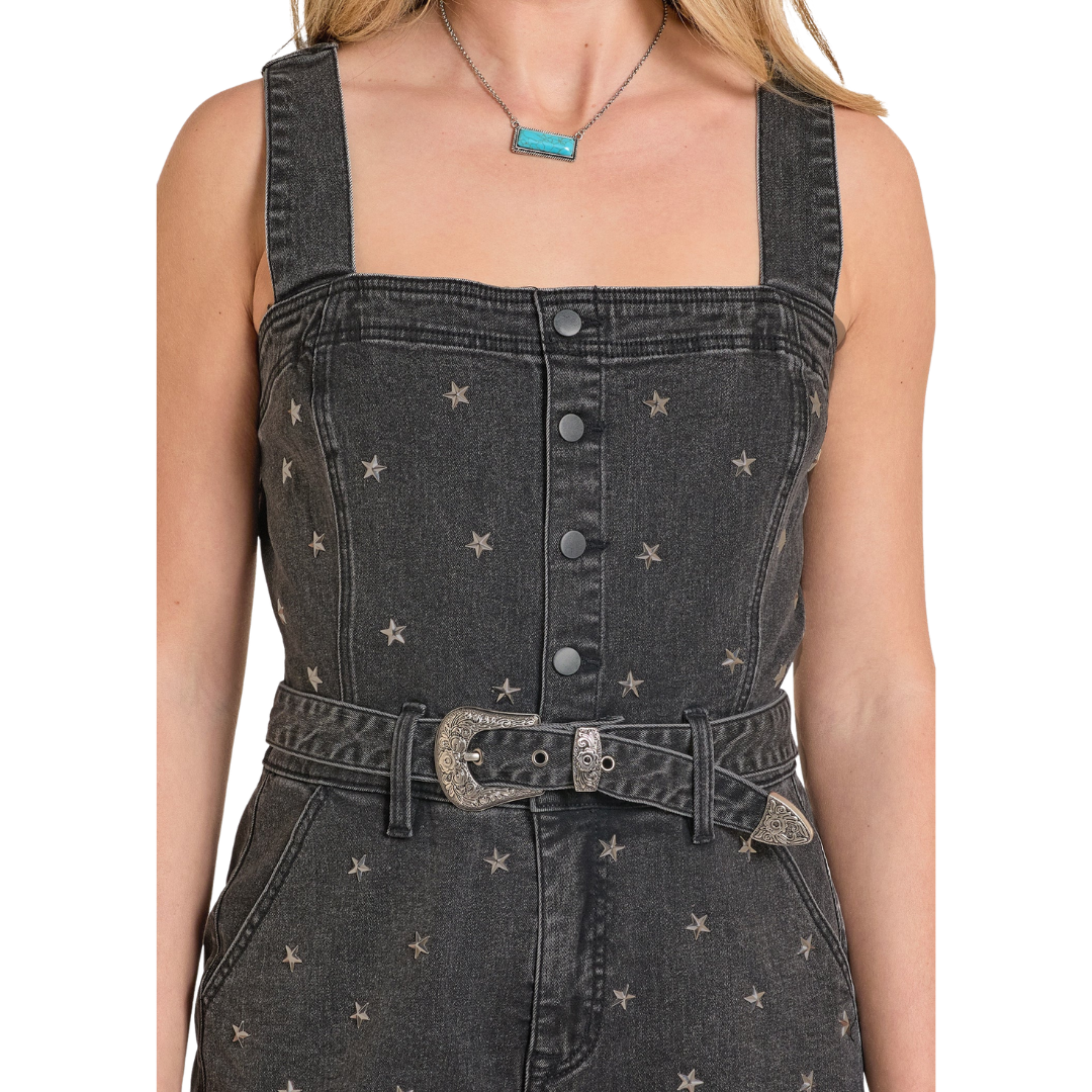 Embrace a stylish look with the Black Star Studded Denim Romper. Made from 92.5% cotton, 6% polyester, and 1.5% spandex, it features stud detailing, a belted waist, and snap closures. A standout piece that refuses to fade into the background.
