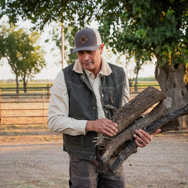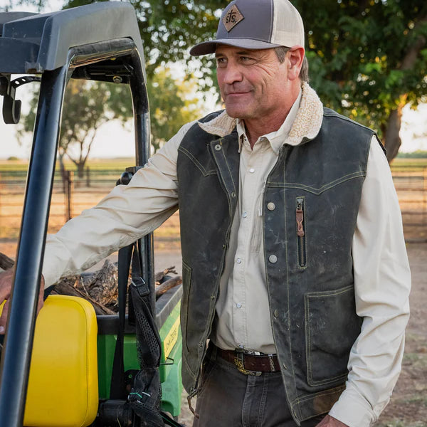 The Owen Canvas Vest from STS Ranchwear delivers rugged functionality wrapped in refined style. Crafted from premium twill canvas with an enzyme-softened finish, this olive vest pairs a plush sherpa collar with classic plaid lining for warmth without bulk. Dual hand pockets, a secure zippered pocket, and a discreet interior pocket keep essentials within reach, while a specialized concealed carry pocket adds practical versatility. The hybrid zip-and-snap closure adapts to your needs throughout the day. Whether you're working the ranch or heading to town, this vest seamlessly bridges durability and sophistication.