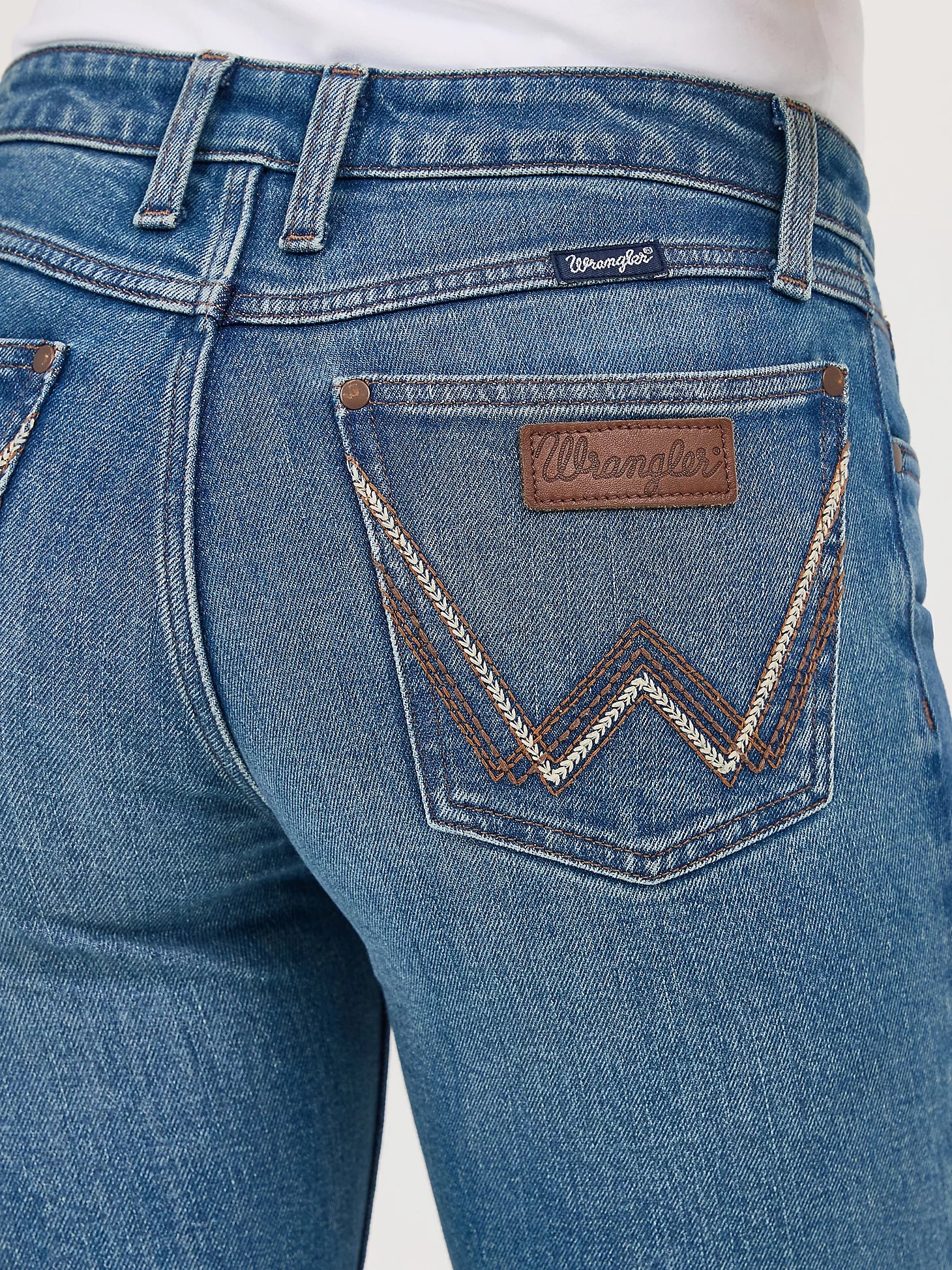Mae places a contemporary twist on a cowgirl cool aesthetic. All Wrangler® jeans for women are designed to accentuate your best assets, but Wrangler's women's Retro® jeans go above and beyond. Wrangler® Retro® jeans pay tribute to Wrangler's Western heritage with the iconic details you know and love, including the leather patch and authentic W stitching on the back pockets. Plus, these women's bootcut jeans come with a figure-flattering, mid-rise fit that's truly versatile. You can easily make this medium wash throwback jean an everyday staple.