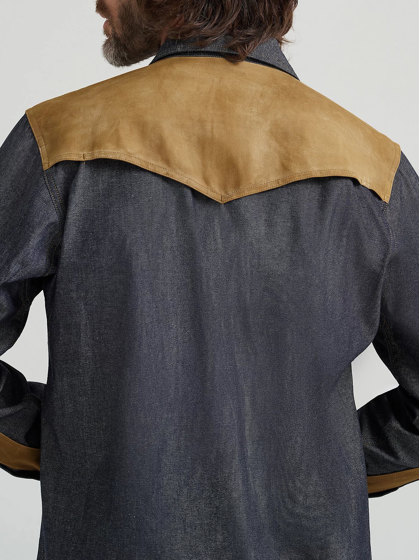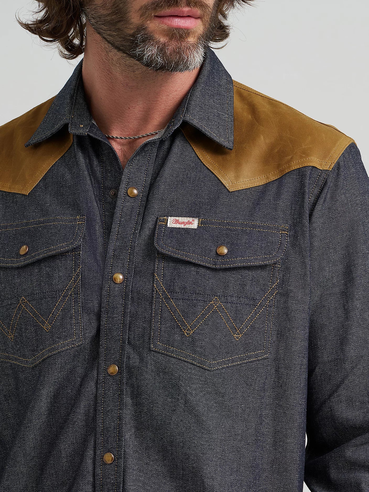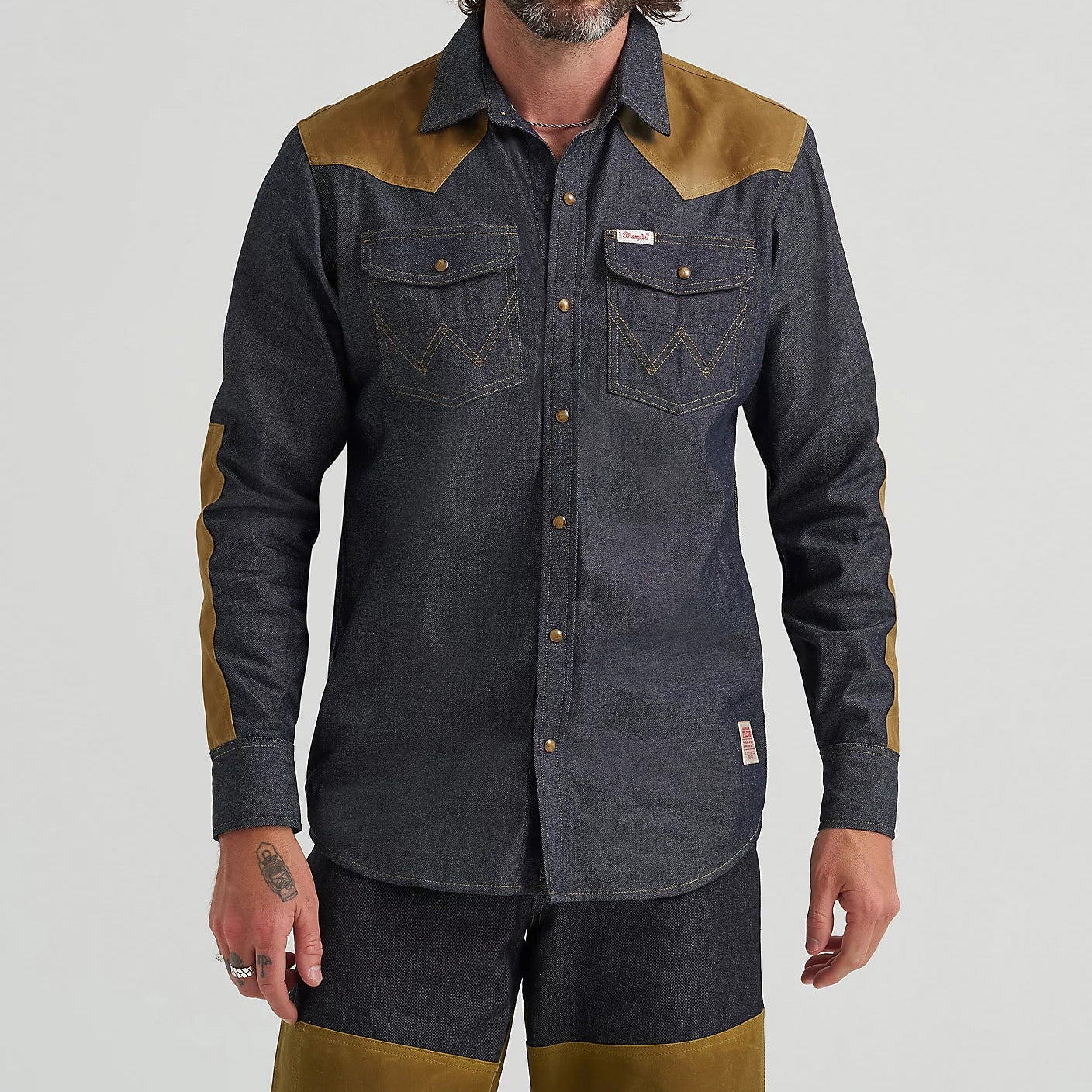 Wrangler x Filson Men's L/S Two-Tone Adventure Western Snap Shirt in Indigo and Tan