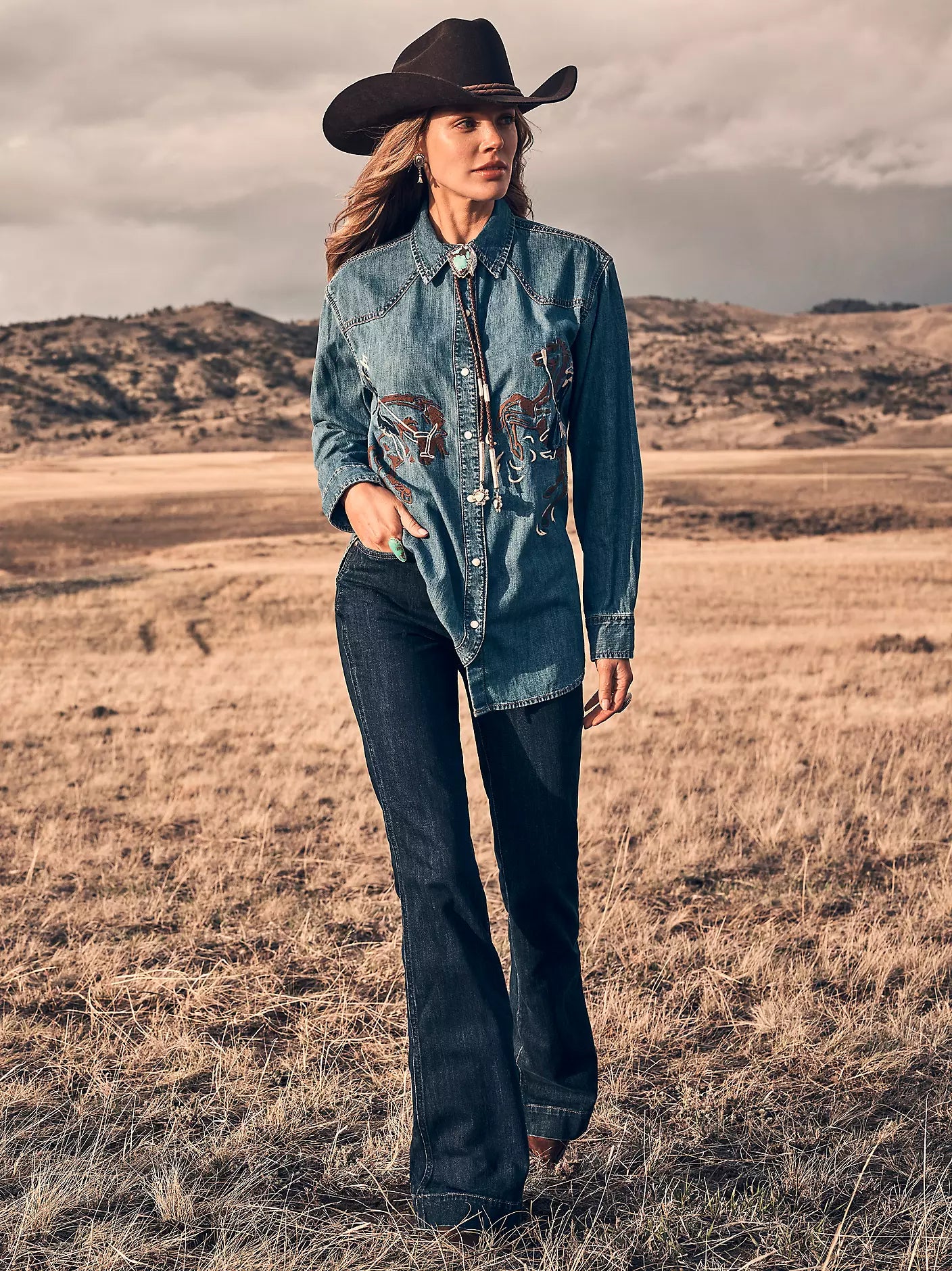 Flattering from every angle, the Women’s Wrangler Retro® Bailey High Rise Trouser Jean is a best-kept secret for ladies who love volume. These denim trousers are crafted from a cotton blend with just a hint of stretch for all-day comfort. They come with a high-rise silhouette, a close fit through the thigh, and a 21.5” flared leg full of vintage vibes. Plus, the five-pocket styling, “W” pocket stitching, and logo patch bring an unmatched level of Western authenticity.