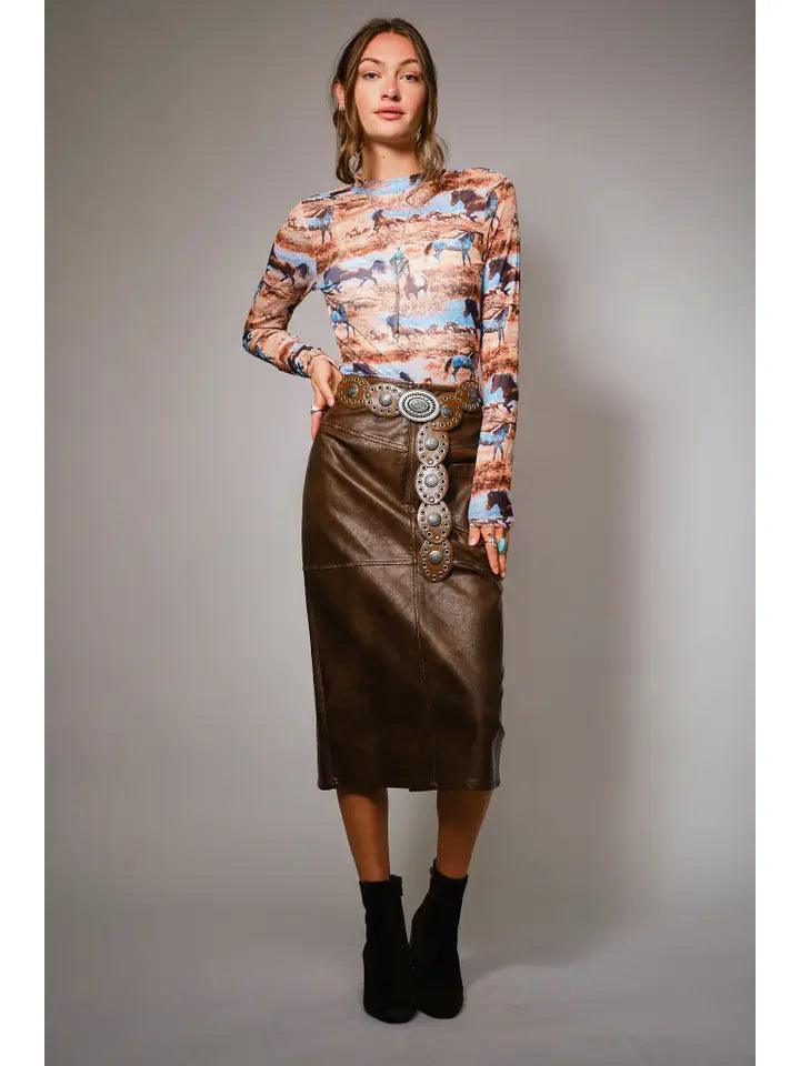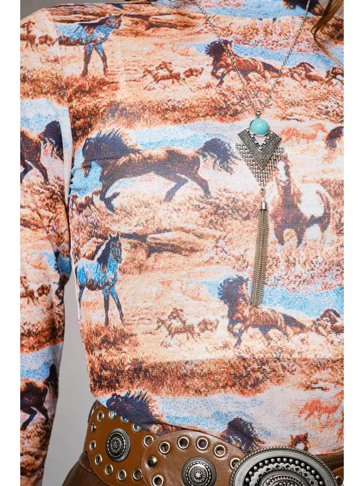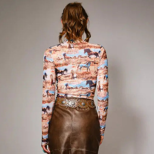Elevate your wardrobe with this Women's Long Sleeve Western Mesh Mock Neck Top, designed to blend bold style with comfortable wear. Featuring a striking western horse print, this top adds a unique country flair while the mock neckline offers a polished touch. Crafted from sheer mesh fabric, it creates a layered, eye-catching look that’s perfect for day or night. The stretchy, fitted silhouette moves with you, ensuring comfort without compromising on style. Whether paired with jeans or layered under a jacket, this versatile top delivers confidence and charm for any occasion.