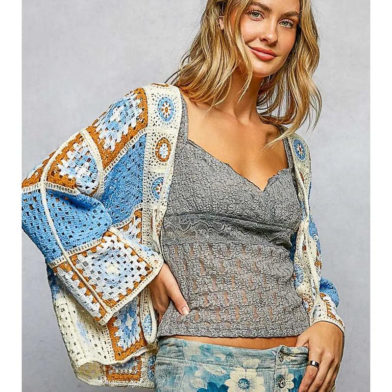 Women's Front Tie Crochet Cardigan in Blue Multi