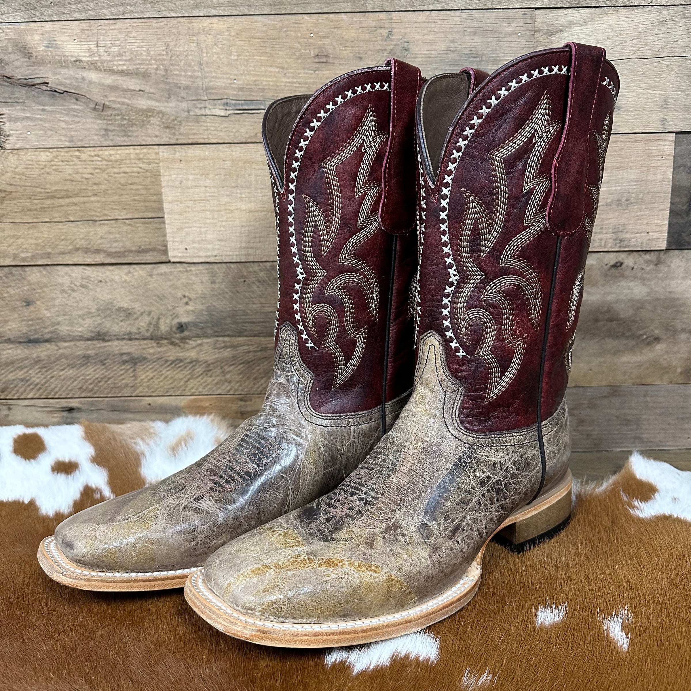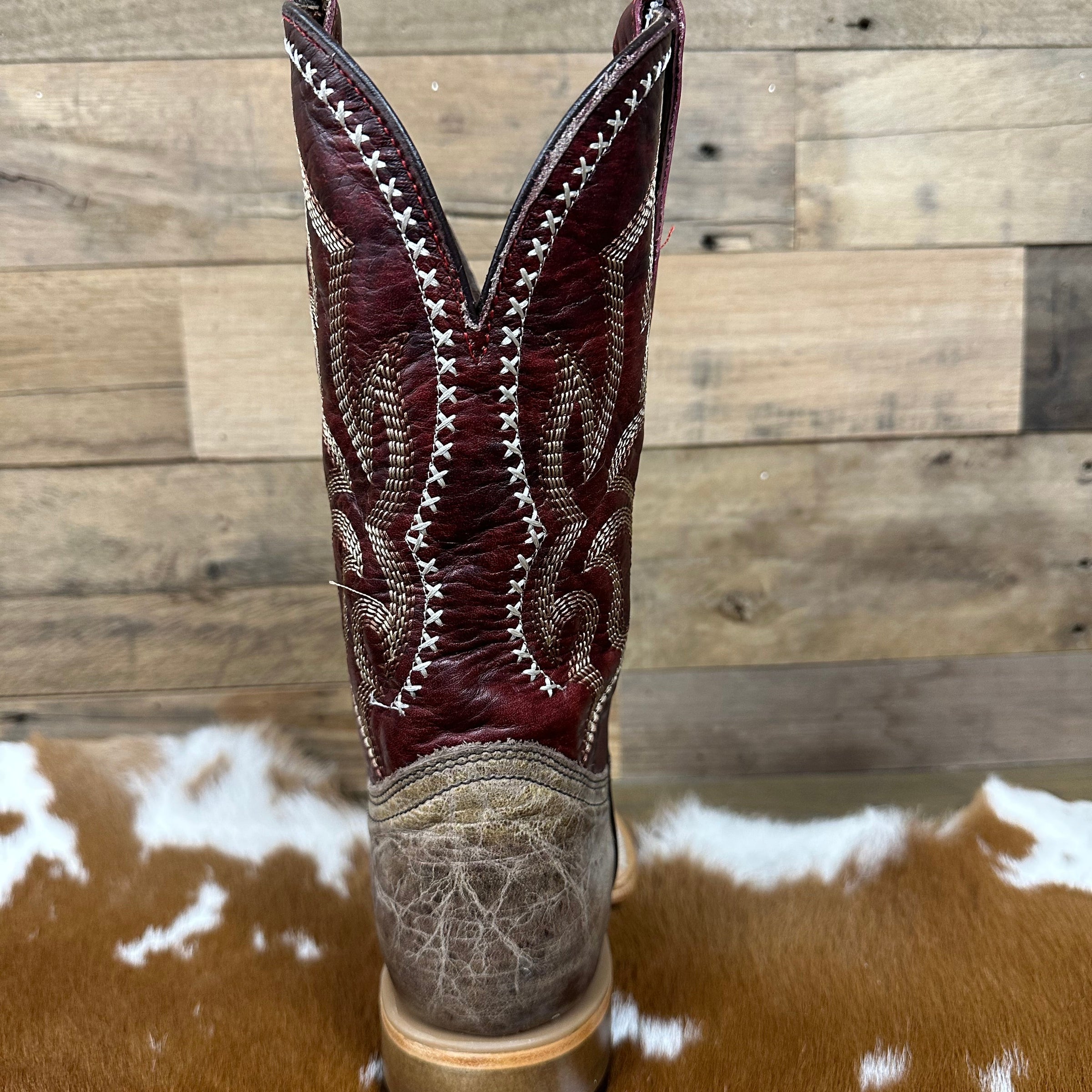 The Circle G Men's 11" Bone Embroidered Wide Square Toe Boot combines classic craftsmanship with modern durability. The vamp and shaft are crafted from premium cowhide leather and the pigskin lining ensures comfort and breathability throughout the day. Burnished bone colored leather on the foot offers a perfect worn-in look right out of the box, and the deep red shaft is accented with contrasting stitching. The distinctive wide square toe offer both style and extra room for comfort while the sturdy 1.5" cowboy heel delivers reliable support and balance. Featuring a leather sole and durable Goodyear welt construction, this boot offers long-lasting wear and easy resoling, making it a dependable choice.